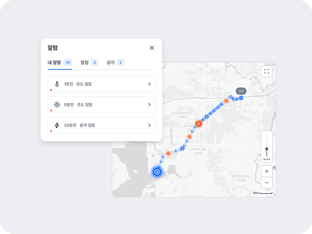 창고부터 국내, 해상, 내륙까지 화물의 위치 및 상태를 파악할 수 있습니다. 화물에 영향을 주는 온습도, 충격, 기울기, 조도 등 정확한 컨디션 정보와 운송 현황을 확인하세요